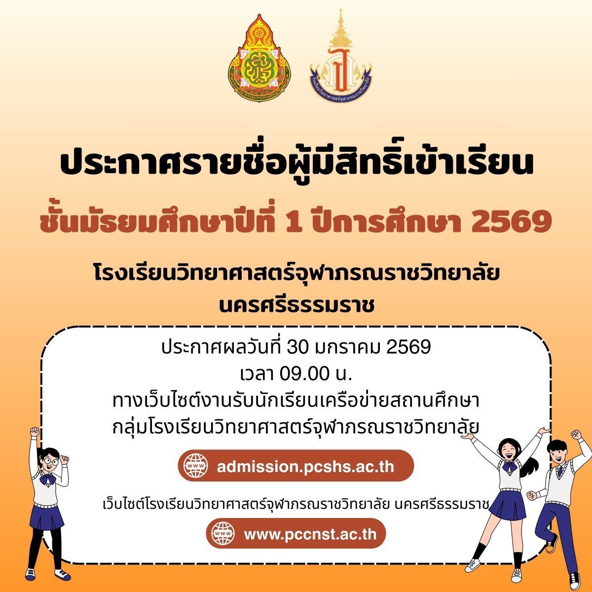 30 ม.ค. 2026 ประกาศรายชื่อผู้มีสิทธิ์เข้าเรียน ชั้นมัธยมศึกษาปีที่ 1 ปีการศึกษา 2569 โรงเรียนวิทยาศาสตร์จุฬาภรณราชวิทยาลัย นครศรีธรรมราช อ่านต่อ