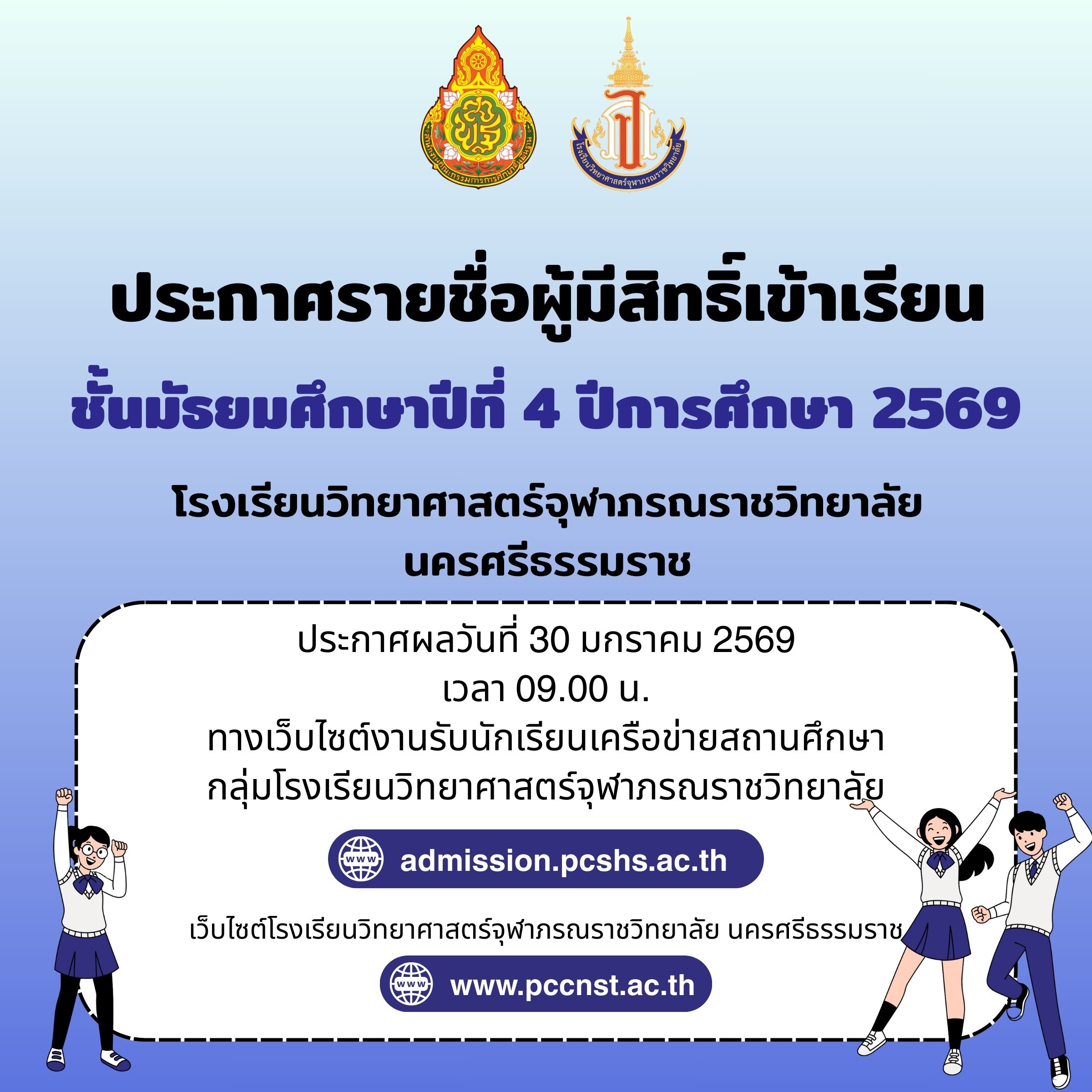 30 ม.ค. 2026 ประกาศรายชื่อผู้มีสิทธิ์เข้าเรียน ชั้นมัธยมศึกษาปีที่ 4 ปีการศึกษา 2569 โรงเรียนวิทยาศาสตร์จุฬาภรณราชวิทยาลัย นครศรีธรรมราช อ่านต่อ