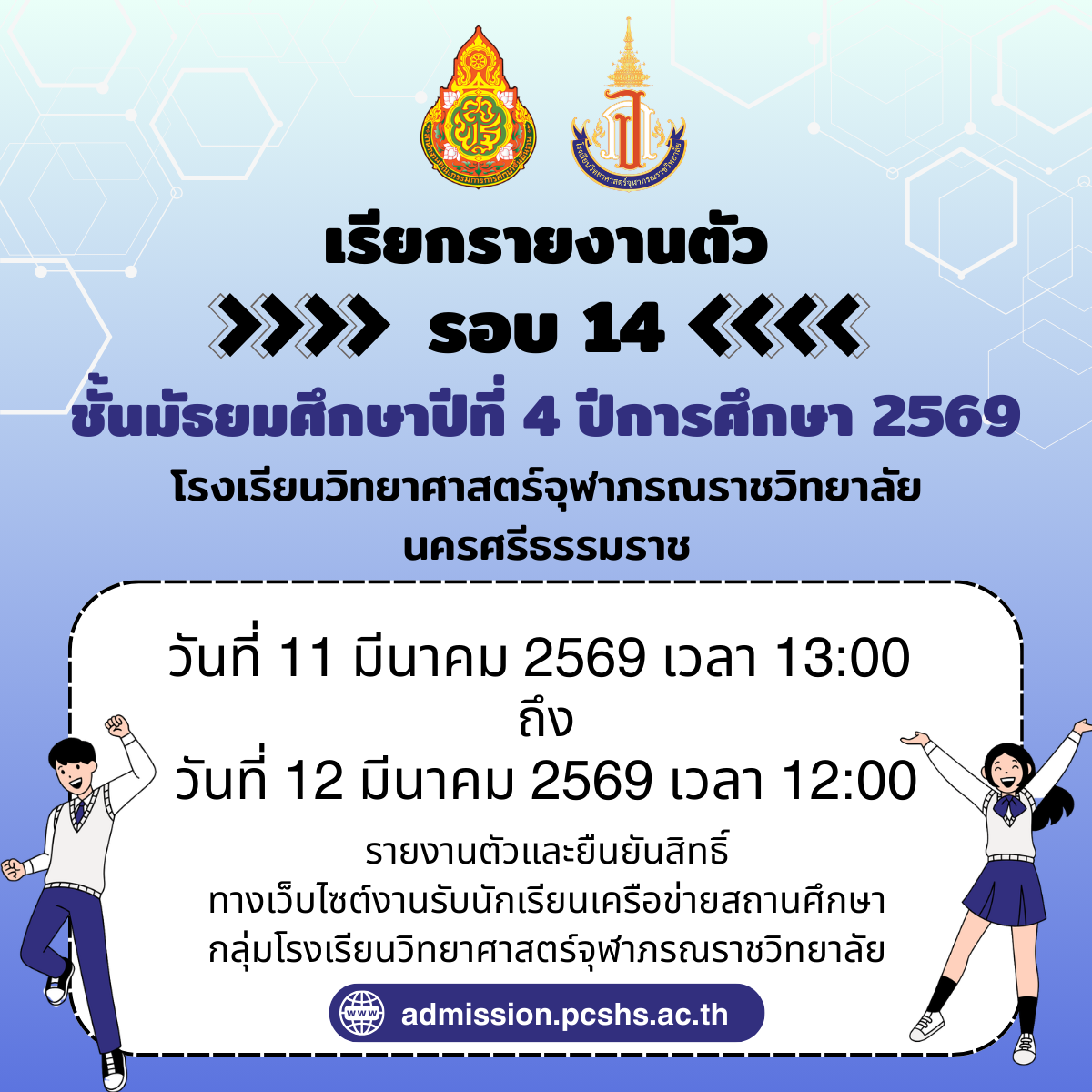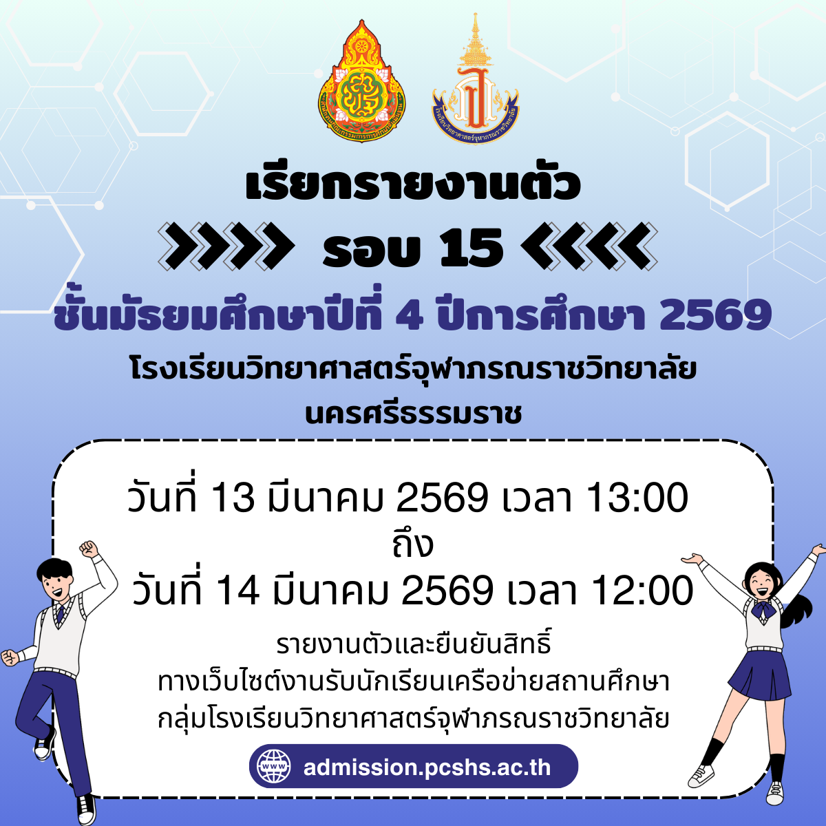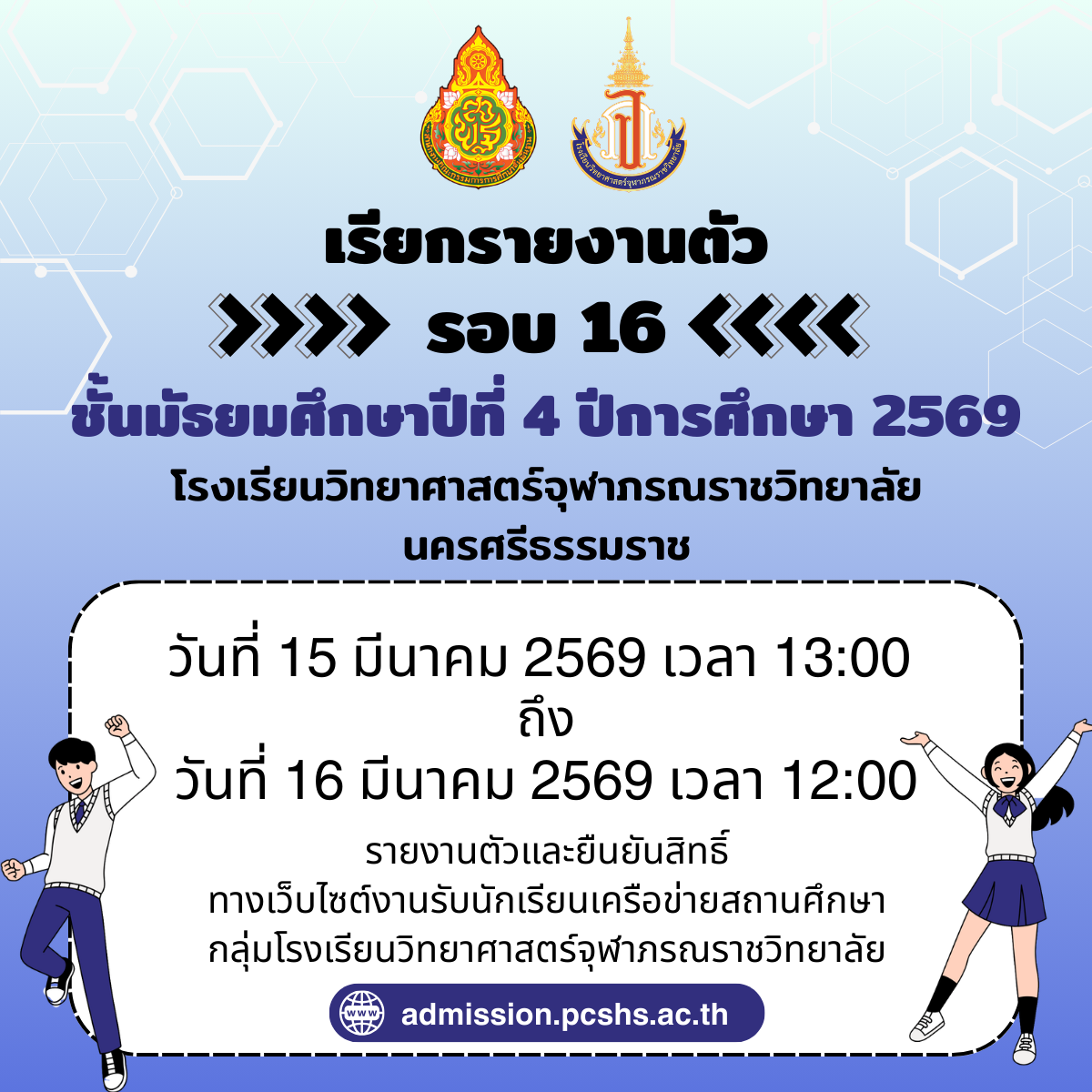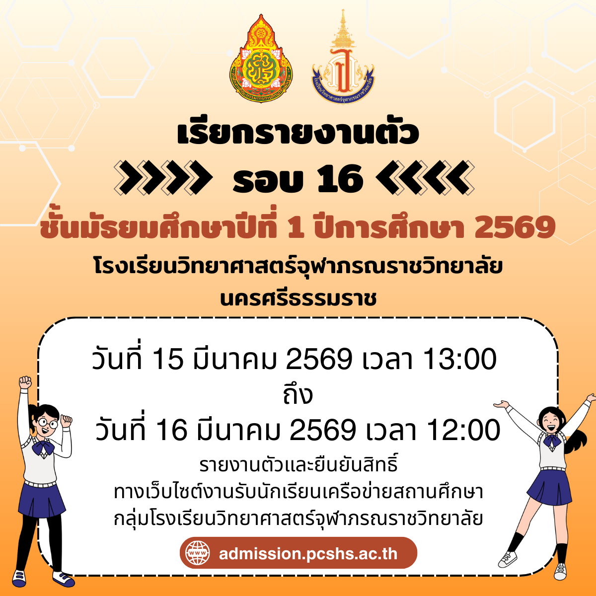 15 มี.ค. 2026 เรียกรายงานตัว รอบ 16 ชั้นมัธยมศึกษาปีที่ 4 ปีการศึกษา 2569 โรงเรียนวิทยาศาสตร์จุฬาภรณราชวิทยาลัย นครศรีธรรมราช อ่านต่อ