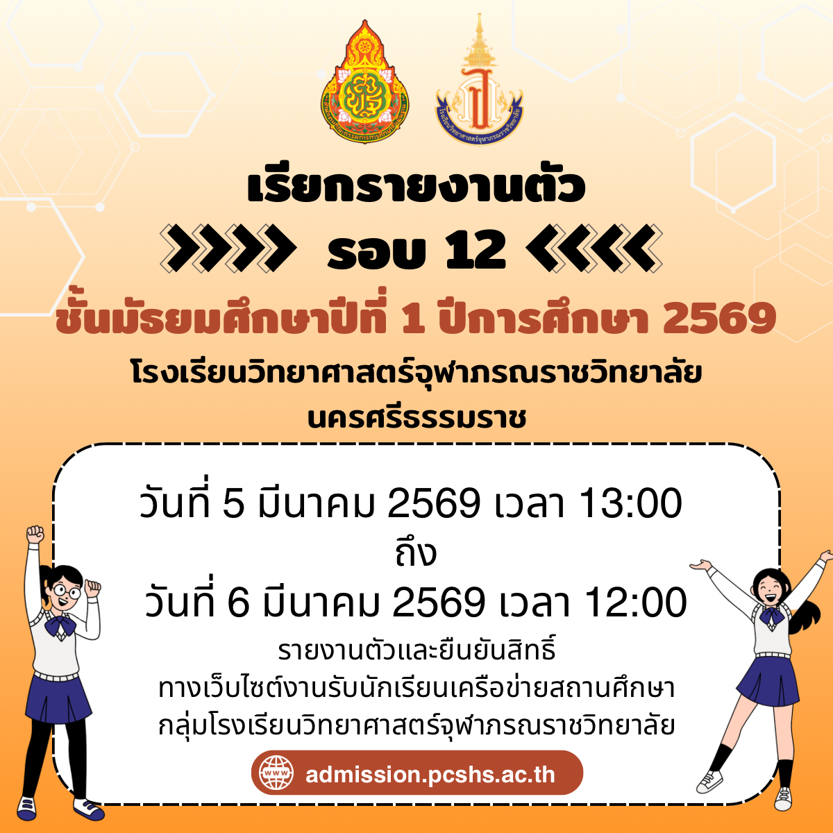 5 มี.ค. 2026 เรียกรายงานตัว รอบ 12 ชั้นมัธยมศึกษาปีที่ 1 ปีการศึกษา 2569 โรงเรียนวิทยาศาสตร์จุฬาภรณราชวิทยาลัย นครศรีธรรมราช อ่านต่อ